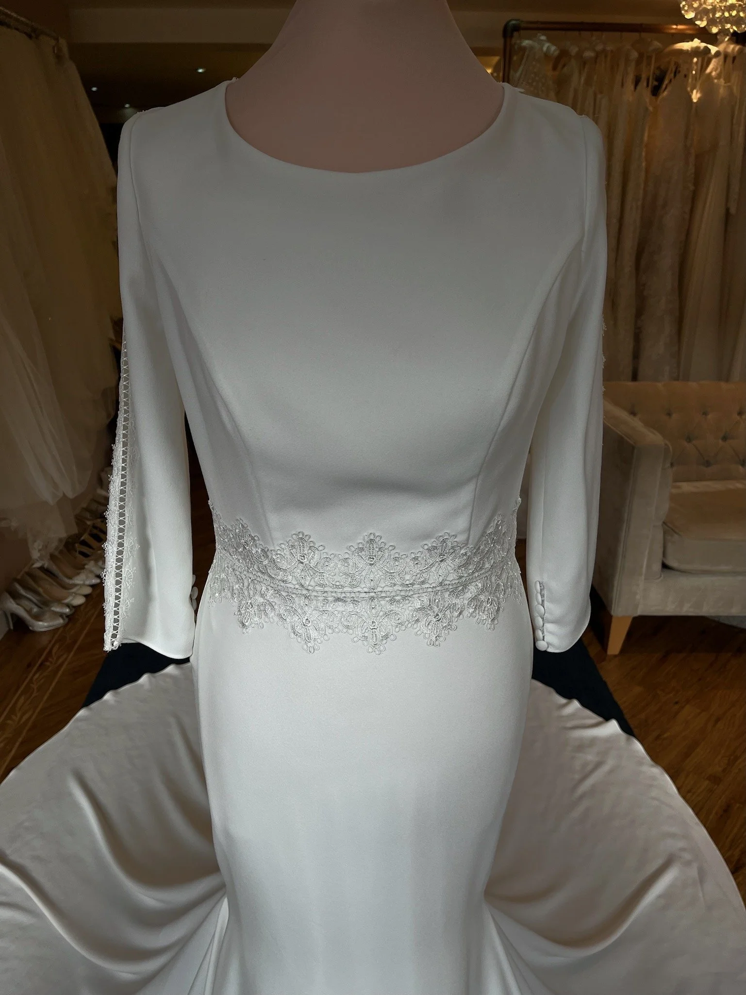 UNALTERED EX SAMPLE WEDDING DRESS, WHICH HAS BEEN TRIED ON IN SHOP ENVIRONMENT ONLY. DRESS WILL NOT BE DRY CLEANED BUT WE DO SPOT CLEAN THEM REGULARLY.
