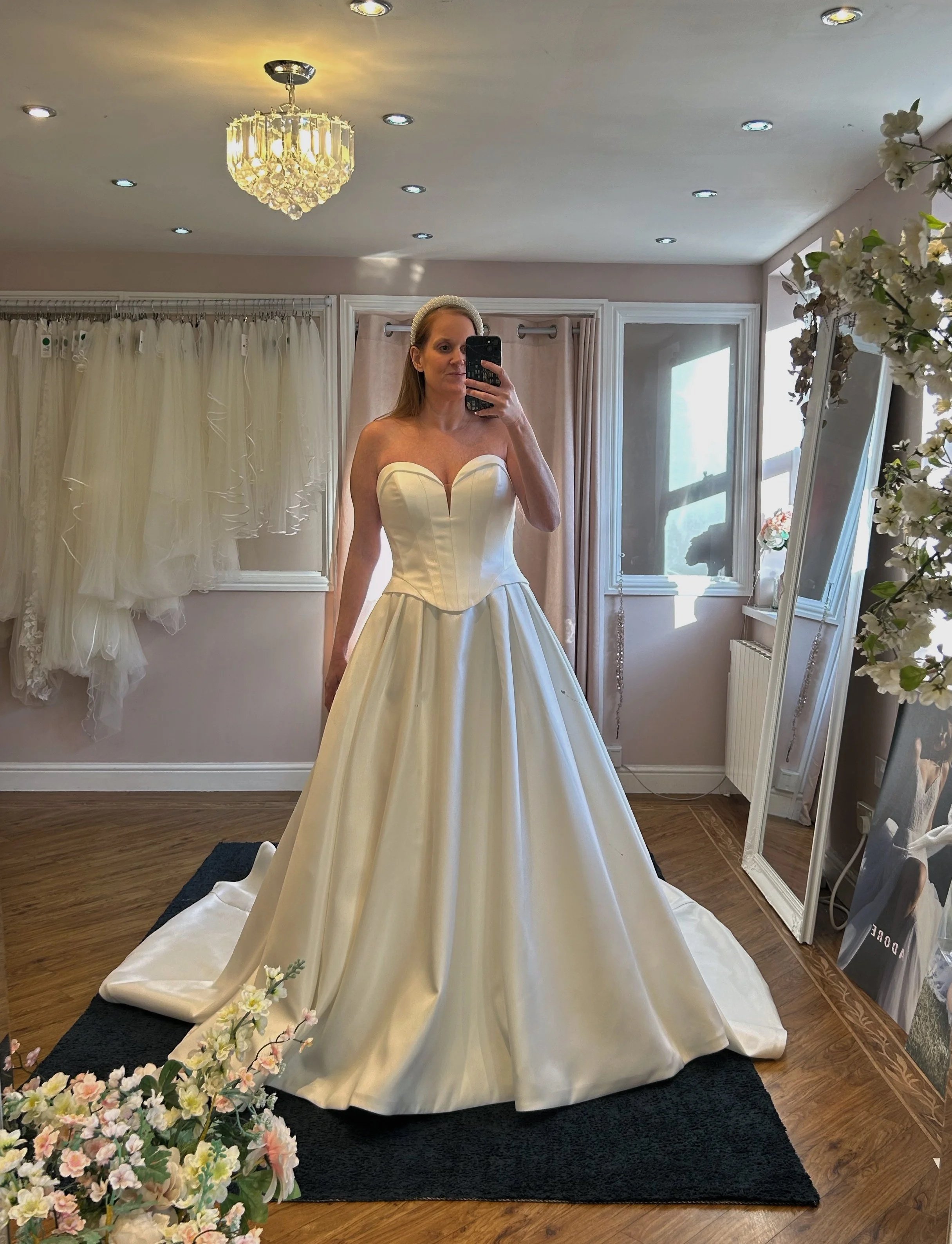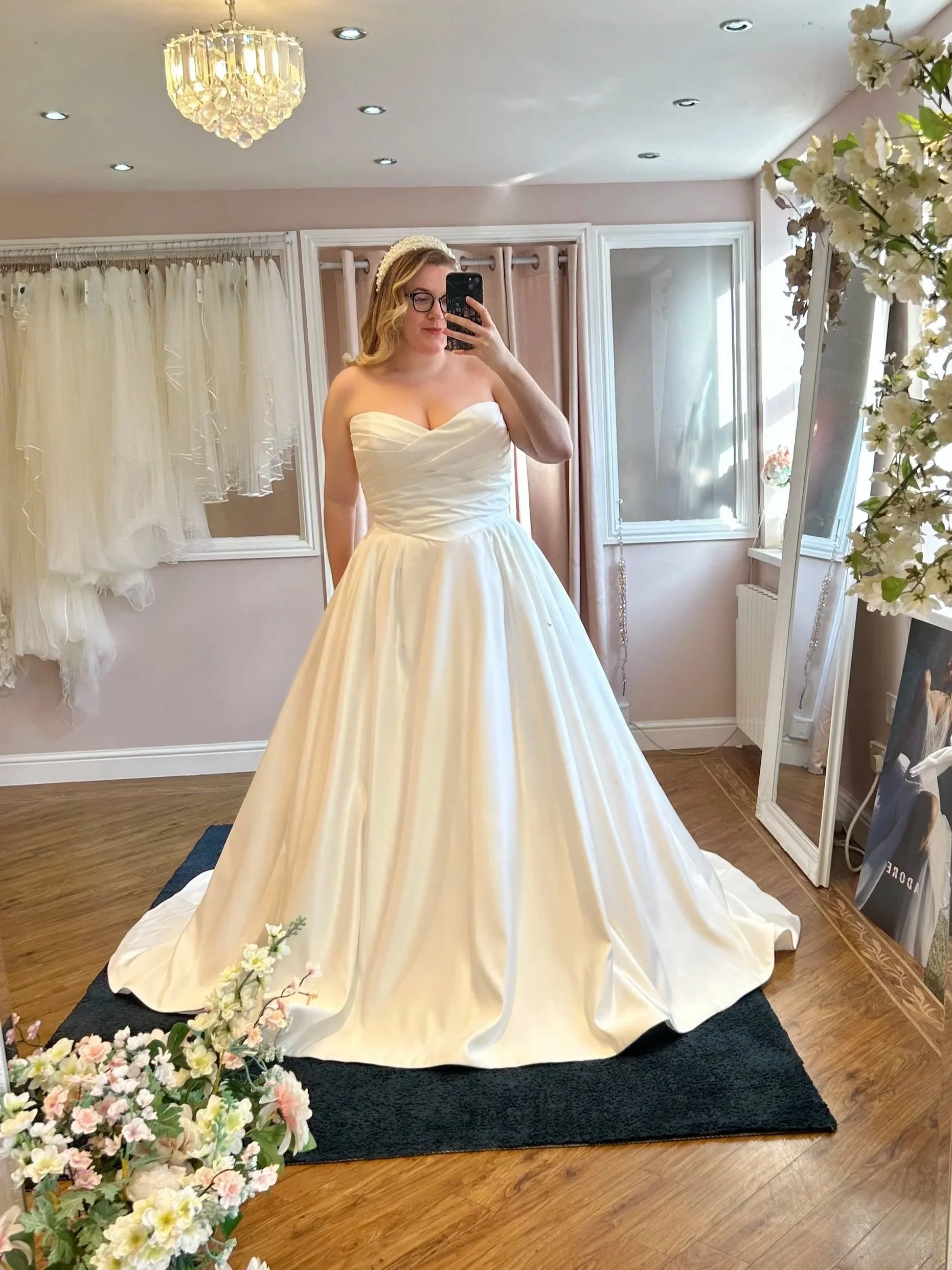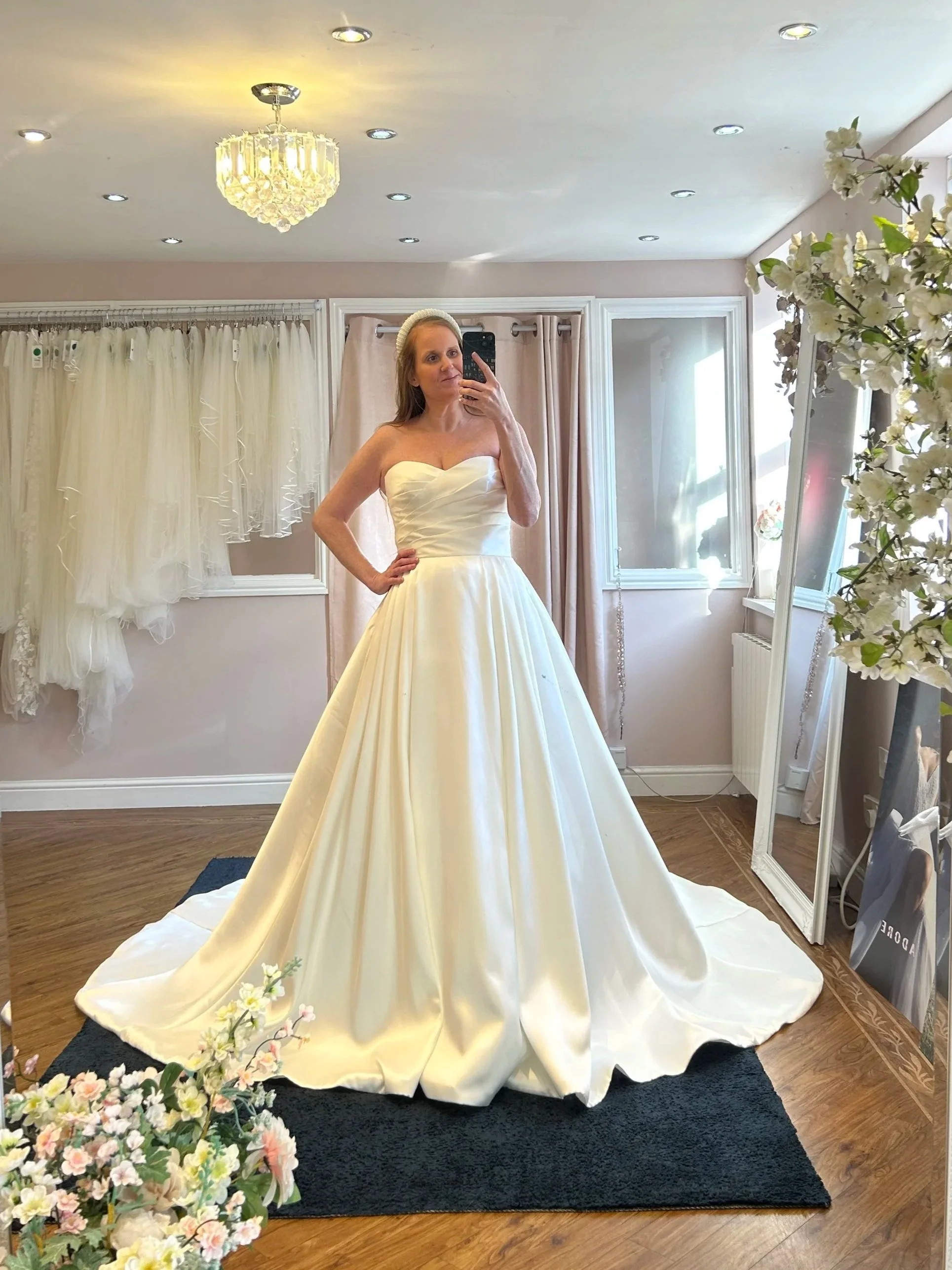Marilyn is a strapless pleated bodice, in the plain duchess satin with a pleated skirt complete with pockets!