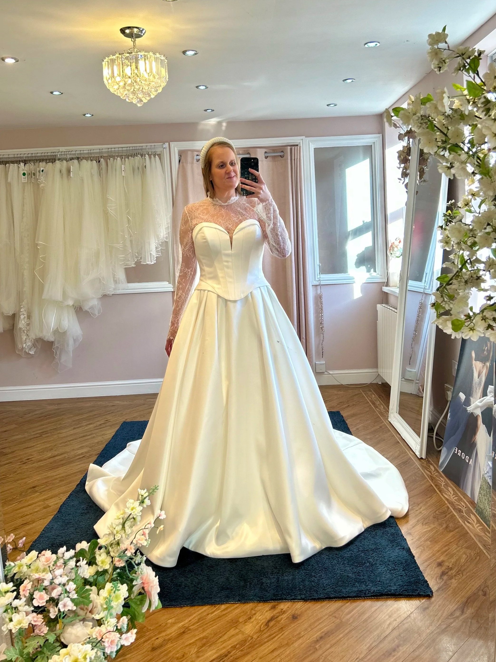 We have two sizes in to try on, one with Ivory satin underneath and the other with oyster. Both are with the extra length train.