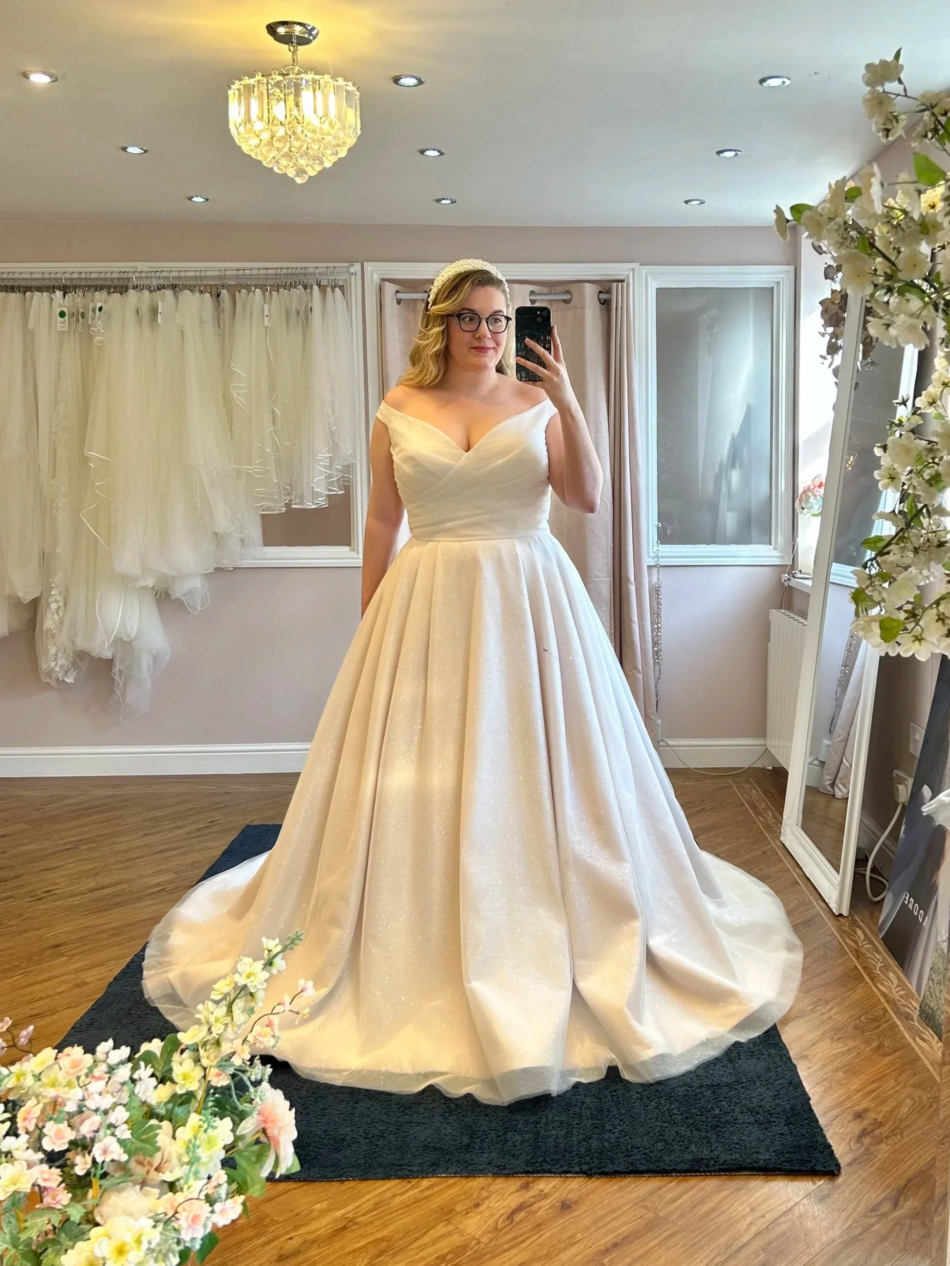 Meredith is an off the shoulder bodice with pleated detailing in the plain duchess satin and stardust tulle with a full pleated skirt complete with pockets! Dress has a zip back and fabric buttons. (also available with a corset back back)