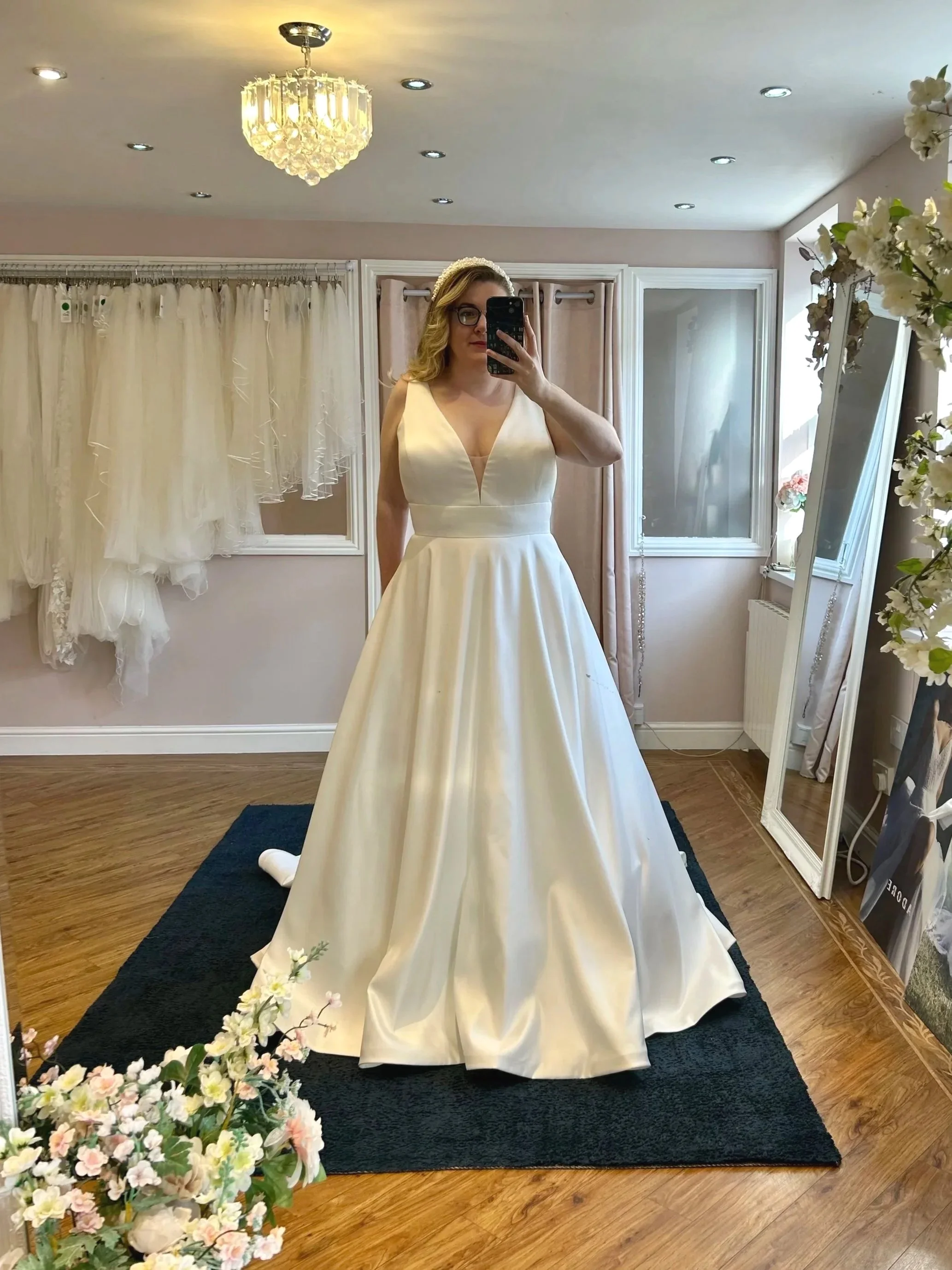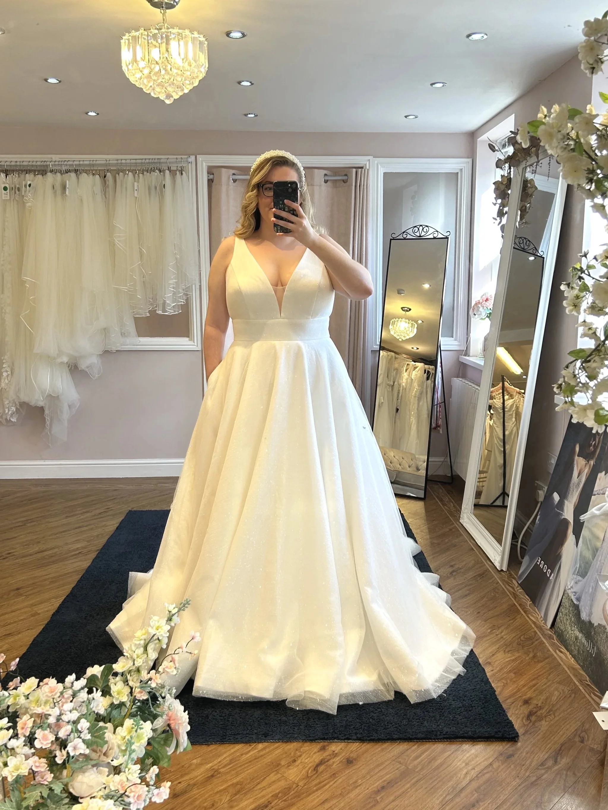 Liza is a ‘V’ neck neckline at front and back with a wide waistband, in the plain duchess satin and stardust tulle with a full skirt complete with pockets! Dress has a zip back and fabric buttons.